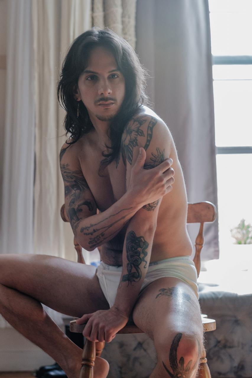 Le décor est brut : pierre chauffée à blanc, pins tordus par le vent, vagues qui claquent. Lui, rasé court, barbe taillée, porte ce mix parfait de douceur et d’animal. Quand il s’appuie contre l’arbre , la peau prend cette brillance salée qui donne envie de le toucher. En slip sportswear , ses obliques et son V dessinent une carte au trésor qu’on a très envie de suivre. Le maillot noir ( glisse sous les doigts, et le soleil souligne son ventre dur et ses cuisses taillées.